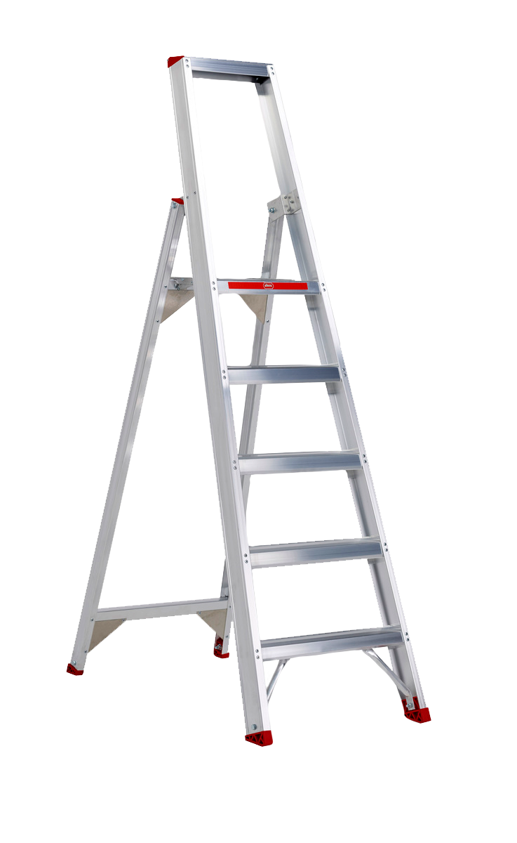 anhand einer Stufenstehleiter mit Plattform und einer beidseitig begehbaren Stehleiter.
