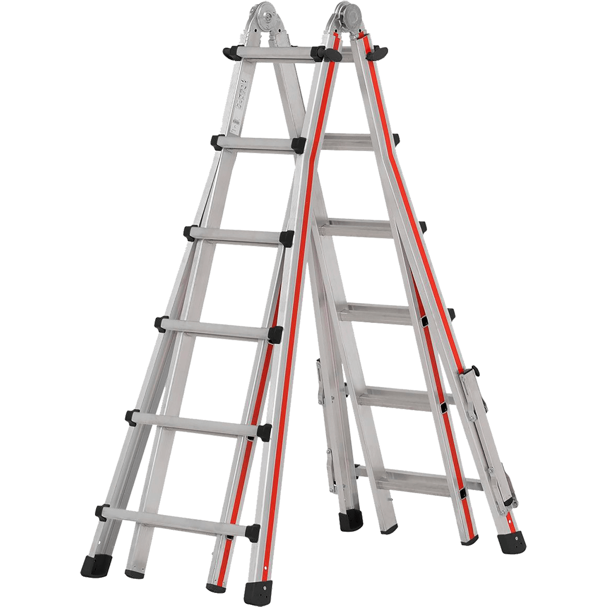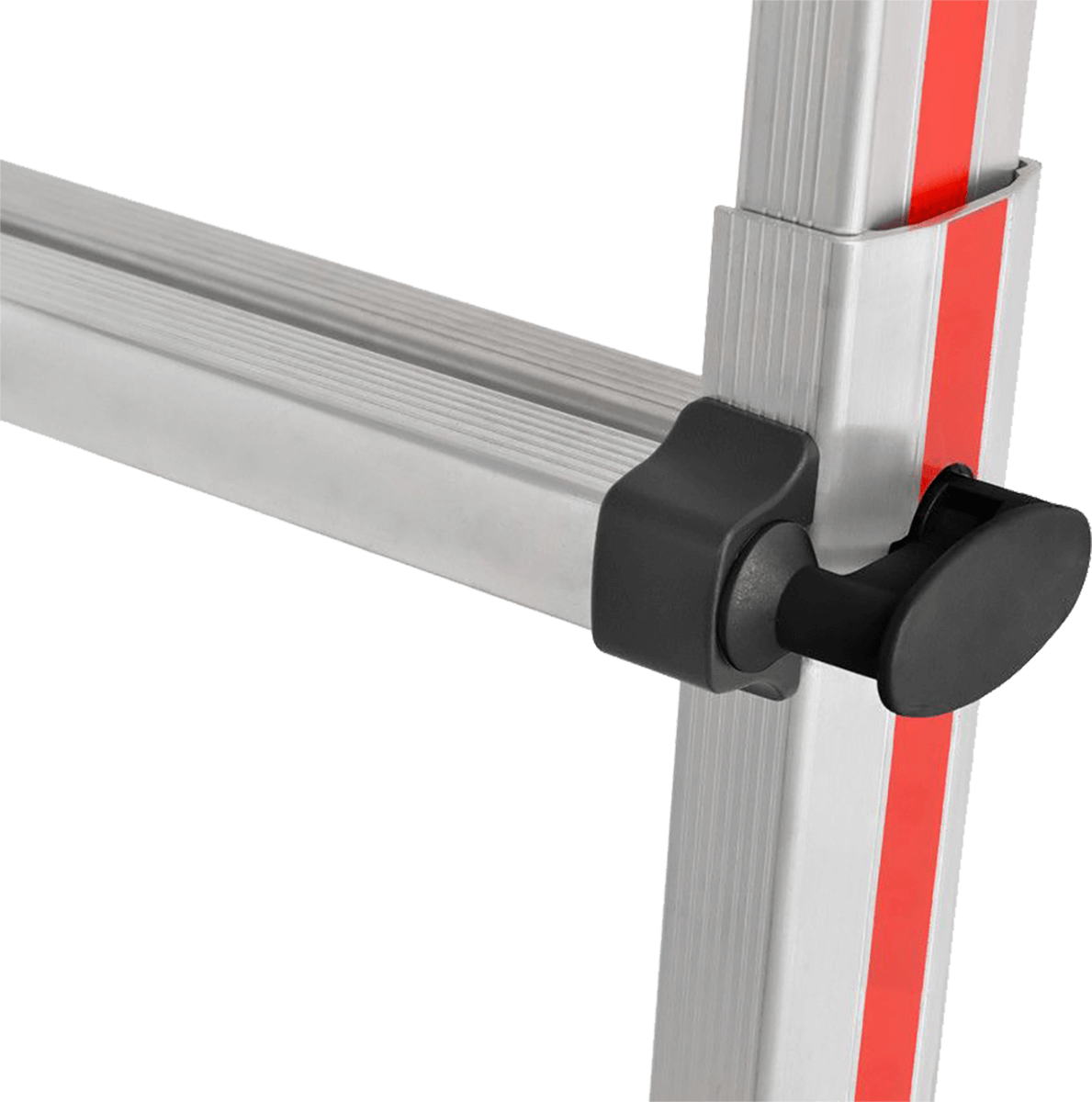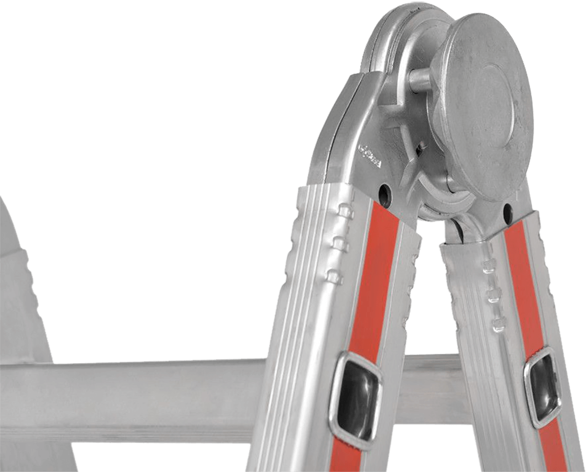 - Ergonomische und wartungsfreundliche Bolzengelenke. In Stehleiterposition kann die Leiter zum Versetzen zusammengeklappt werden, ohne vorher das Gelenk lösen zu müssen.
