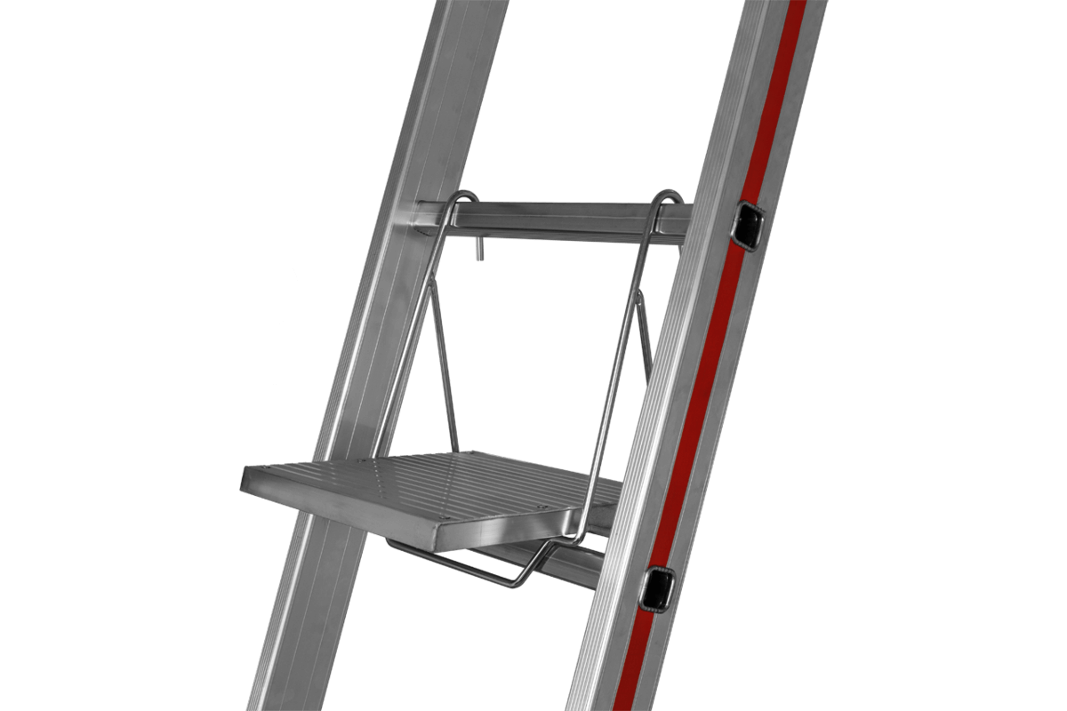 Durch den hochklappbaren Tritt ist ein sicheres Besteigen der Leiter gewährleistet.