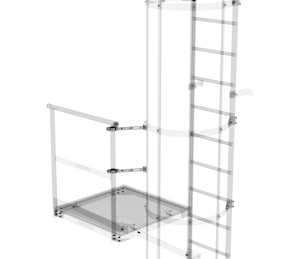 Zur Anbringung zwischen Geländer des Grund- oder Erweiterungs-podestes und dem Rückenschutzbügel, um den dortigen Spalt im Bereich des Handlaufs und der Knieleiste zu schließen.