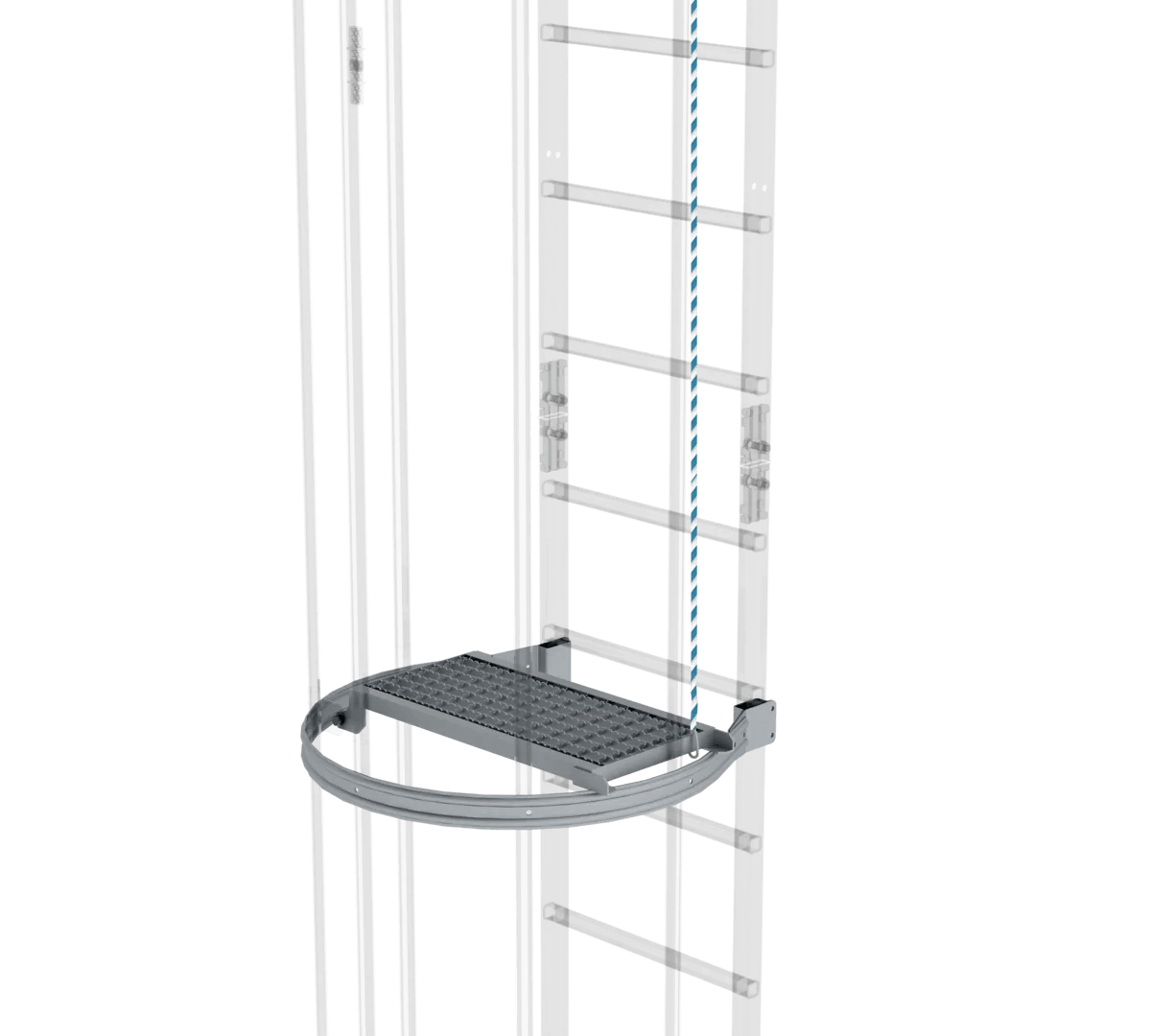 - Als Ruhepodest bei einzügigen Steigleitern einsetzbar. Befestigung mittels eines zusätzlichen Bügels am Rückenschutz. Ein Bügel im Lieferumfang enthalten inkl. Zugseil zur Bedienung von oben. Nicht für Notleiteranlagen nach DIN 14094-1 geeignet.